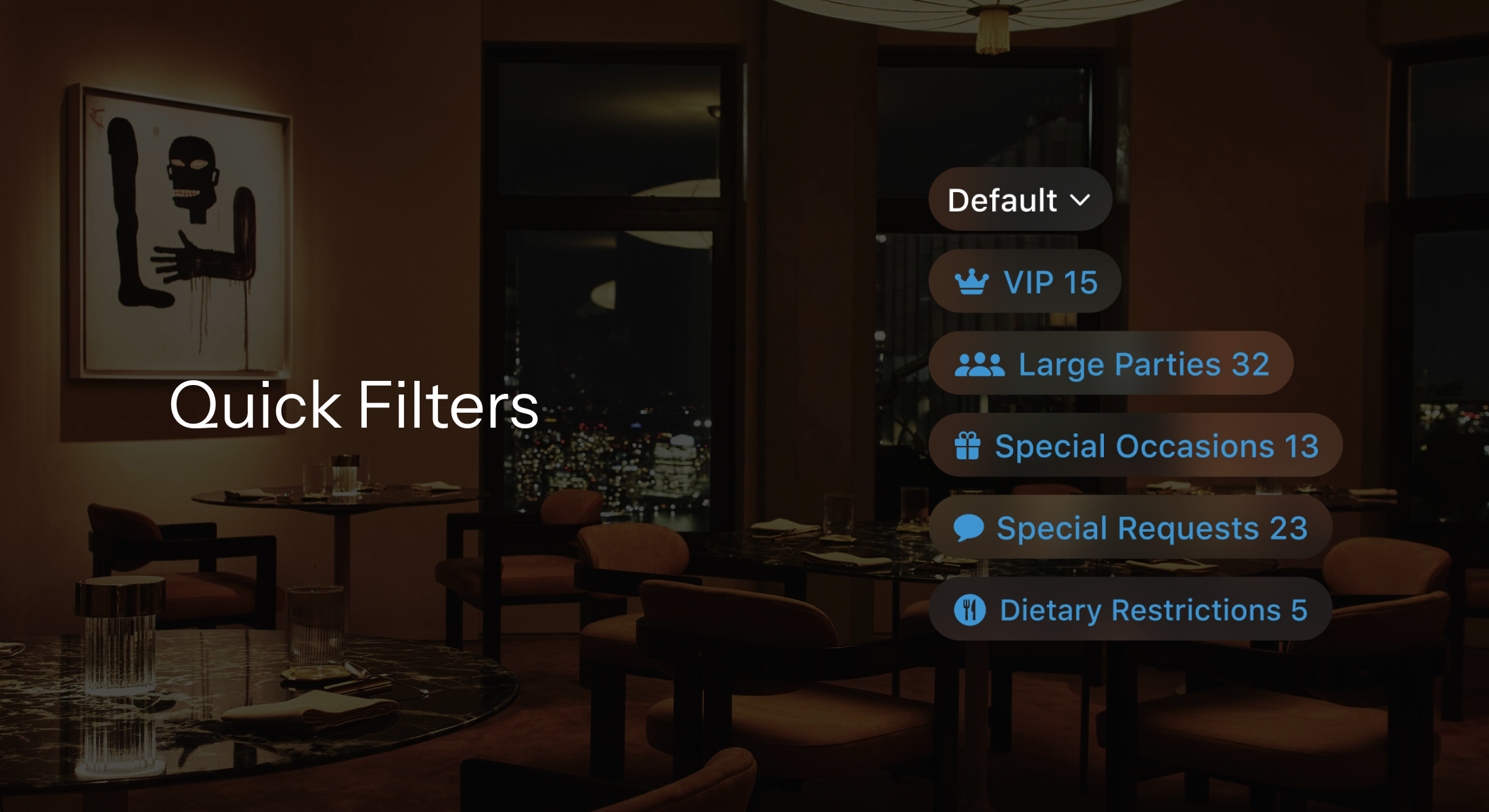 The tool emphasizes key insights, including allergy details, dining preferences, past history with the restaurant, and reviews. It also offers an overview of the day's notes on specials, events, or requests, facilitating easy reference for staffs.